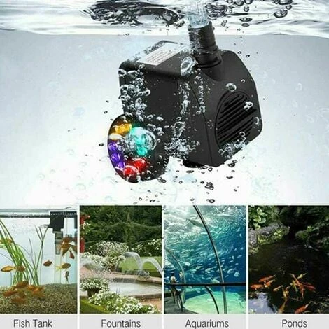 1 x pompa fontana con LED 【12 LED Luci】: la pompa della fontana utilizza 12 luci LED colorate super luminose ea risparmio energetico e 4 luci colorate (rossa, blu, verde, gialla). Le luci a LED della pompa dell’acqua forniscono un’incredibile illuminazione notturna e sono impermeabili. Ideale per decorare fontane interne, piscine, fontane per animali domestici, stagni, acquari, pompe per acquari, idroponica e statue Gli organismi acquatici possono fornire ossigeno sufficiente. È molto adatto come pompa per acquari e pompa per laghetti. Anche la pompa dell’acqua utilizza la tecnologia del movimento continuo. Senza L & rm; rm quando funziona, non influisce sulle persone