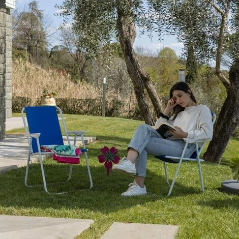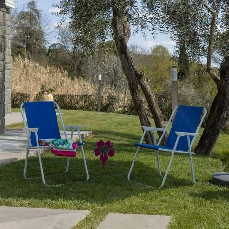 Baroni Home Sedia pieghevole da Esterno perfetta per il mare. la spiaggia. per la piscina o il giardino. Comoda e leggera per trasportarla dove vuoi. dotata di manici per garantire maggiore comfort e relax ai tuoi momenti di pausa. Disponibile in svariati colori sgargianti e allegri Caratteristiche del prodotto: Colore: Blu Misure: 52x44x76 cm Materiale: Alluminio Pu¥ sostenere fino a 110kg Pieghevole Con manici