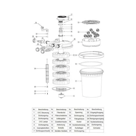 Filtro a pressione che funziona meccanicamente e biologicamente con una lampada UV integrata. Tutte le connessioni e il processo tecnico sono nel coperchio, in modo da poter seppellirlo senza problemi.