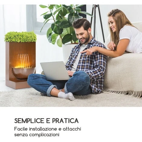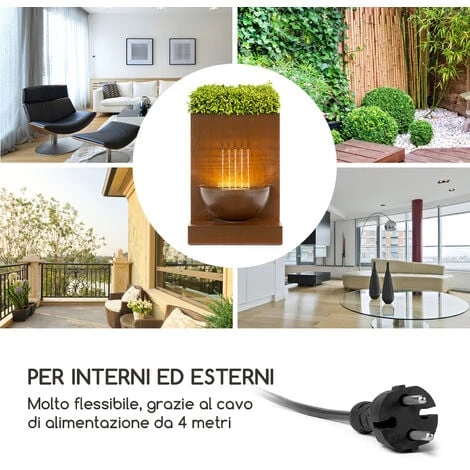 Attraverso 5 aperture, l’acqua ricade nella vasca sottostante, creando dei bellissimi archi. Una barra LED lunga 20 cm illumina al meglio lo spettacolo e mette in risalto i 5 brillanti getti d’acqua. Sopra alla piccola cascata si trova una cavità, appositamente pensata per posizionare fiori o piante. I boccioli in fiori o il verde lussureggiante, uniti al costante flusso d’acqua, impreziosiscono ogni giardino o soggiorno e donano un tocco di frizzante vitalità. La costruzione in metallo zincato garantisce un look raffinato, mentre la tonalità color terra sottolinea la sua naturalezza.