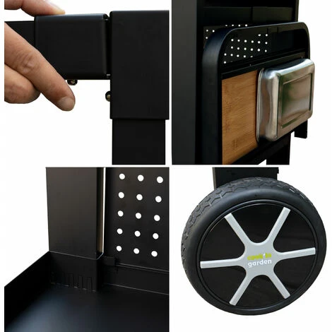 Scegliete un accessorio completo per il giardino che vi aiuti a preparare i vostri pasti estivi. Questo carrello da giardino è facile da spostare dalla cucina alla terrazza grazie alle sue due ruote e consente di portare con sé tutto il necessario per grigliare sulla plancha. Ha due piastre forate, una delle quali può essere utilizzata come credenza per proteggere la piastra di cottura dal vento. In questo modo si dispone di un piano di lavoro, di un vassoio basso e di un ripiano laterale, che può essere ripiegato per risparmiare spazio quando si ripone il carrello. Questo carrello plancha è dotato di accessori come tagliere, vassoio per le spezie, ganci, ecc.