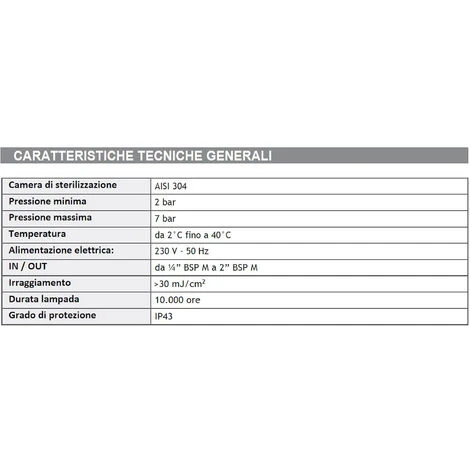 DEBATTERIZZATORE ACQUA A RAGGI U.V. MONOLAMPADA 1360 LT/H per la disinfezione dell’acqua