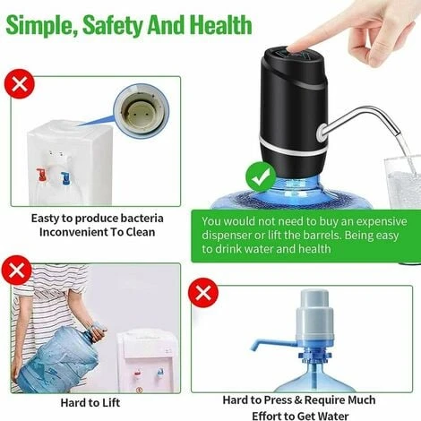 Pompa dell’acqua elettrica con batteria: pompa dell’acqua con batteria integrata; Può essere utilizzato per 30-40 giorni o sufficiente per circa 4-5 bottiglie d’acqua da 18,9 litri quando è completamente carico. La pompa per acqua potabile è ideale per l’uso domestico o in ufficio, le sue dimensioni compatte la rendono facile da trasportare, ideale per escursioni, picnic, eventi sportivi per bambini, giornate in spiaggia e barbecue . L’aspiratore elettrico automatico è molto comodo e utile. Dispositivo elettrico e di pompaggio adatto per acqua potabile in bottiglia pura.