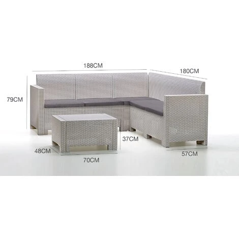 CARATTERISTICHE TECNICHE – Interamente composto in resistente polipropilene, permette di essere posizionato all’aria aperta, resistendo ai raggi solari e alla pioggia, è impermeabile e idrorepellente – Lavabile, facile da pulire – Montaggio semplice e veloce – Ideale per ospitare 5 persone – DIMENSIONI PRODOTTO IN CM – Sofà: 188-180x57h79, Tavolino: 70x48h37