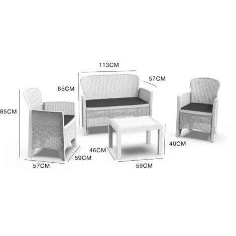 STRUTTURA E UTILIZZO – Articolo formato da un elegante set da esterno per due persone, composto da due sedie con schienale e braccioli, un divano a due posti ed un tavolino, cuscini inclusi – Le sedute spaziose ed accoglienti garantiscono relax e comodità in casa propria – Salottino perfetto per arredare il proprio spazio outdoor o indoor, grazie alla composizione in plastica rinforzata con effetto rattan che ne accresce lo stile – Perfetto per brunch ed aperitivi in terrazzo, veranda, giardino o per rilassarsi a bordo piscina.