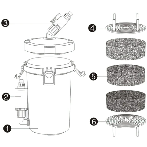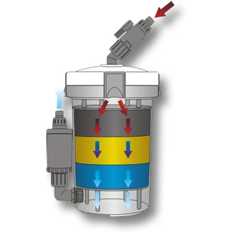 Il filtro viene fornito con materiali filtranti per i 3 stadi. I cestelli con pratici manici possono essere riempiti a piacere con il materiale filtrante. Tenere presente che i materiali filtranti si classificano da grossolani a fini. Il 1° stadio di filtraggio sulla parte superiore trattiene efficacemente lo sporco grossolano e prolunga di molto la durata del materiale filtrante biologico che si trova negli stadi sottostanti. Il pre-filtro può essere rimosso semplicemente ed è facile da pulire.
