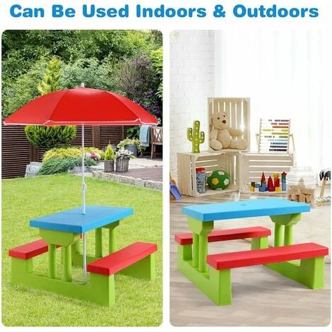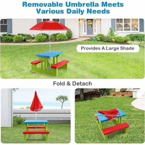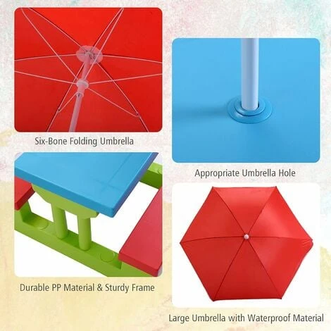 - Colori vivaci: ci sono un totale di 2 stili di colore da scegliere. I colori vivaci attirano l’attenzione dei bambini e sono profondamente amati dai bambini. Il design pratico di 2 panche + un tavolo + un ombrellone permette ai bambini di godersi la vita all’aria aperta.
