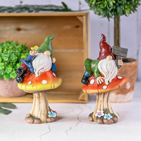 Modello unicoDue gnomi da giardino si arrampicano sui funghi e giocano comodamente nella foresta. Il nano con berretto rosso e il nano con berretto verde tengono in mano un cartello di benvenuto e un fioremano, ti salutano, sei il benvenutoVisita il nostro giardino. E i colori dei funghi e dei nani sono molto simili agli alberi della foresta, che aggiungono un elemento naturaleIl tuo giardino