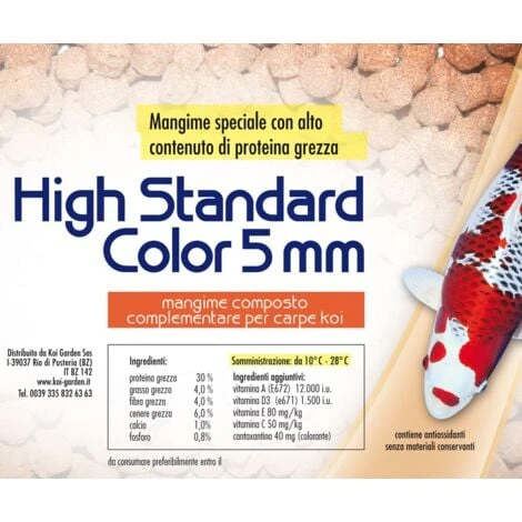 Il mangime koi High standard color puó essere somministrato durante tutto l´anno fino a una temperatura d´acqua di 7° C. Consigliamo di arricchire il mangime con gli integratori.