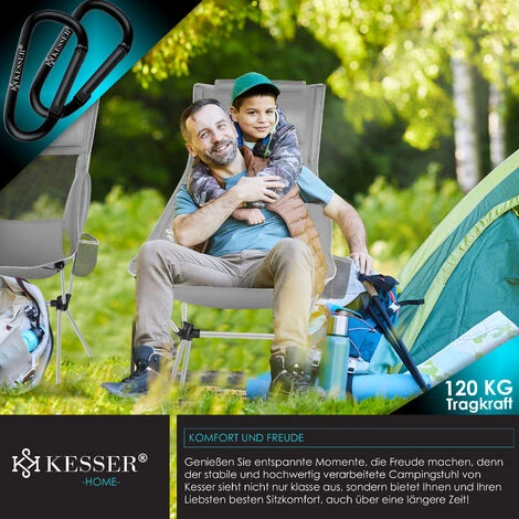 Sedia da campeggio KESSER in tessuto in poliestere traspirante e idrorepellente, il robusto telaio in alluminio garantisce una capacità di carico fino a 120Kg, Incl. accessori extra come portabevande integrato, borsa per la custodia e moschettone.
