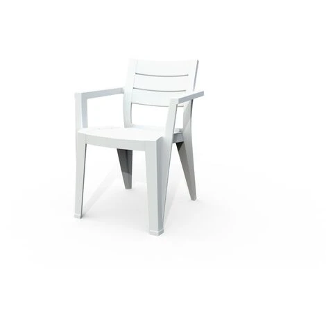 Design elegante e moderno. Ha una seduta ampia con braccioli molto resistenti. Completamente in resina di colore bianco, resistente ai raggi UV e alle condizioni atmosferiche avverse. Dimensioni 61,5 x 58,5 x 79 centimetri.