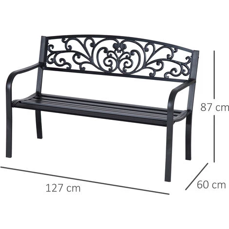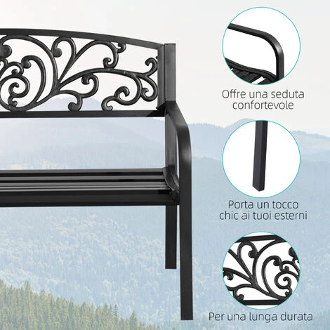 Goditi un pomeriggio di relax all’aria aperta con questa panchina da giardino Outsunny! Costruita in metallo e rifinita con vernice antiruggine è robusta ma confortevole. Il suo design classico si integra perfettamente con ogni tipo di arredamento, e il suo schienale con decorazioni floreali è perfetto per dare un tocco vintage al tuo ambiente!