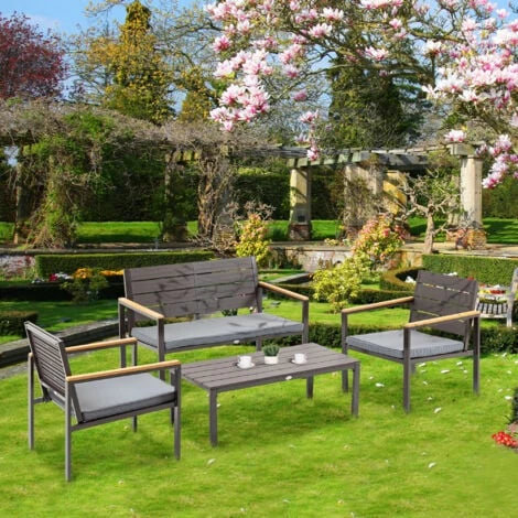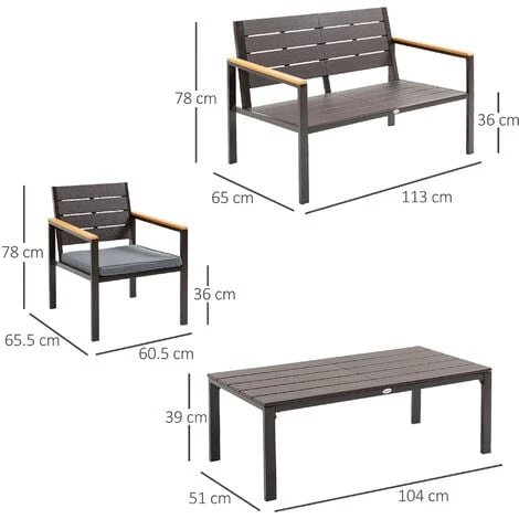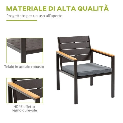 Trasforma il tuo terrazzo nel solarium di un hotel a 5 stelle con questo salotto da giardino Outsunny. Composto da 4 pezzi, include 2 poltrone, 1 tavolino e 1 divano da esterno: le sedute sono costruite in acciaio, mentre il piano d’appoggio del tavolino è in legno. In aggiunta, hai dei comodi cuscini sfoderabili e lavabili: indispensabili per assicurarti il massimo del comfort.
