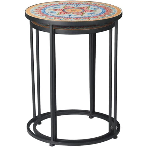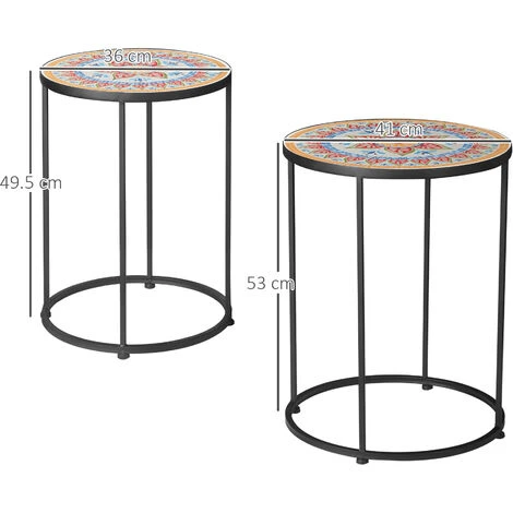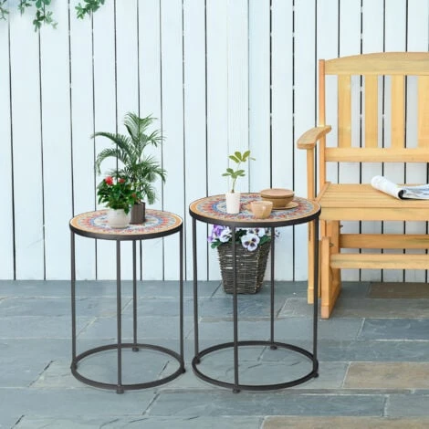 Per un’aggiunta unica ai tuoi mobili da giardino, scegli questo bellissimo set di tavolini da giardino Outsunny. Realizzati con un robusto e durevole telaio in metallo verniciato a polvere con processi di elettroforesi, i tavoli sono caratterizzati da un bellissimo piano d’appoggio in mosaico ceramico resistente alle macchie e facile da pulire. Tavoli da giardino perfetti per rilassarsi o per prendere un gelato con amici e famiglia in un caldo pomeriggio estivo.