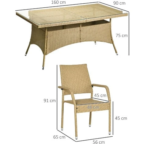 Questo set da giardino di sette pezzi di Outsunny crea un ambiente invitante, ideale per ogni area esterna. La solida struttura in metallo antiruggine è circondata da vimini in PE a forma semicircolare, per offrire una maggiore durata e resistenza agli agenti atmosferici. Il piano in vetro temperato del tavolo da pranzo è facilissimo da pulire e aggiunge un look elegante al set. Le sedie da pranzo possono invece essere impilate per essere riposte in modo compatto quando non vengono utilizzate.