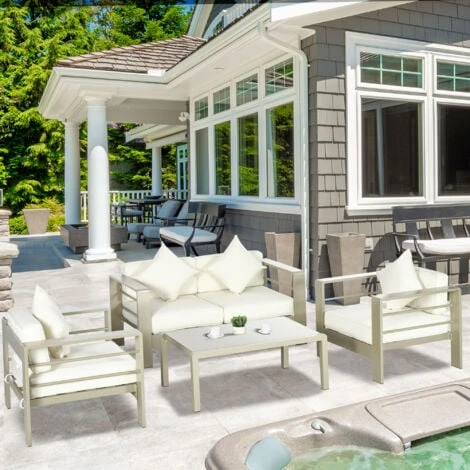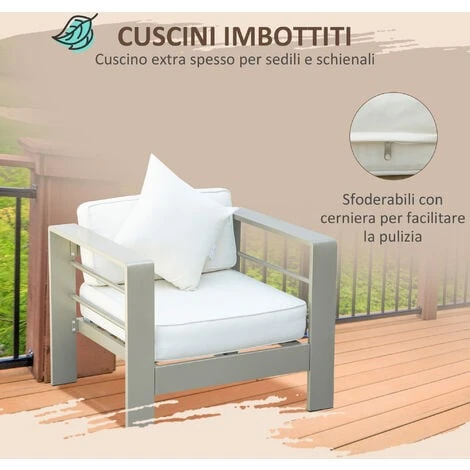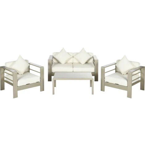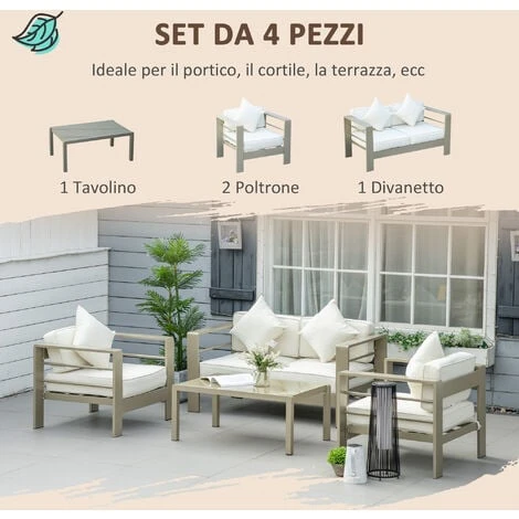 Questo set da giardino da 4 pezzi di Outsunny è composto da un divanetto per esterni insieme a due poltroncine da giardino e un tavolino da caffè. La struttura in alluminio garantisce una buona resistenza al peso ed il suo rivestimento a polvere protegge dalle intemperie. I cuscini inclusi con spessa imbottitura assicurano un comfort extra. Goditi i momenti all’aperto con questo set da giardino, non solo bello ma anche facile da pulire.