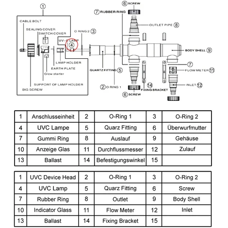 Vi preghiamo di notare che sono necessari due tubi per la sostituzione completa, mentre qui riceverete un solo tubo UV (lampada UVC).