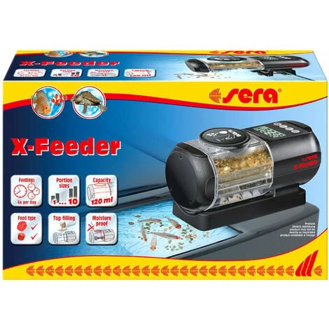 La mangiatoia automatica Sera X-Feeder consente quattro diversi settaggi di distribuzione al giorno. La quantità. di mangime può. essere regolata in dieci fasi in base alle esigenze individuali. .