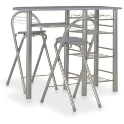 È realizzato in legno resistente e le superfici sono facili da pulire. I telai in acciaio offrono grande stabilità. Le sedie possono essere ripiegate quando non in uso, in modo da risparmiare spazio. Inoltre, sono presenti alcune mensole e un portabottiglie sotto al tavolo, in questo modo potrete tenere i vostri oggetti a portata di mano e in ordine.