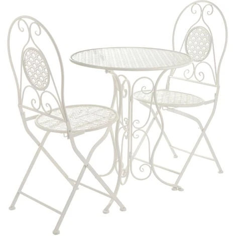 Aggiungi un tocco romantico e in pieno stile shabby chic al tuo arredo esterno con il set Bistrot composto da tavolino e 2 sedie. Sarà perfetto per godersi una bella colazione, ma anche il pranzo o la cena in coppia all’aria aperta. Realizzato interamente in ferro, è curato nei minimi dettagli per offrirti un set d’arredo davvero unico e funzionale. Le sedie sono pieghevoli per riporle occupando il minimo ingombro durante l’inverno o quando ti serve più spazio per muoverti sul balcone. La struttura in metallo è solida e resistente e il piano rotondo del tavolo e la seduta delle sedie sono traforati, consentendo il deflusso dell’acqua in caso di pioggia. Tuttavia per preservare più a lungo la qualità del prodotto si consiglia di riporlo al riparo da pioggia e umidità. Misure tavolino: 60xh71 cm, portata massima 20 kg. Misure sedie: 37,5x45xh93,5 cm, portata massima 100 kg. Le sedie sono già assemblate, il tavolino è da assemblare e completo di kit di istruzioni.
