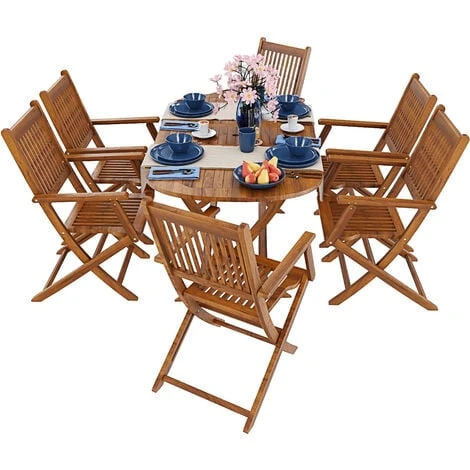 Resistente alle intemperie e alla formazione di muffe grazie alla sua finitura a olio, il set con tavolo pieghevole e 6 sedie in acacia “Kuantan” non tende a deformarsi ed è perfetto anche in veranda o sotto un pergolato.
