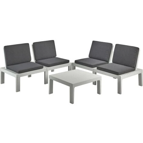 STRUTTURA E UTILIZZO – Articolo formato da un elegante set da esterno per quattro persone, composto da quattro sedute con schienale ed un modulo multifunzione – Le sedute spaziose ed accoglienti garantiscono relax e comodità in casa propria – Il modulo può essere utilizzato comodamente come tavolino centrale oppure può essere posizionato tra le sedute – Salottino perfetto per arredare il proprio spazio outdoor o indoor, grazie alla composizione in plastica rinforzata con effetto doghe che ne accresce lo stile – Perfetto per brunch ed aperitivi in terrazzo, veranda, giardino o per rilassarsi a bordo piscina.