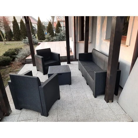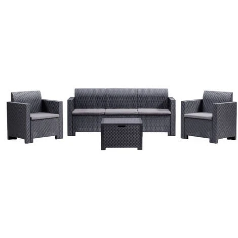 STRUTTURA E UTILIZZO – Articolo formato da un elegante set da esterno per 5 persone composto da 2 poltrone con schienale alto ed ergonomico, 1 sofà 3 posti, 5 cuscini inclusi, 1 tavolino porta cuscini – Perfetto per arredare il proprio spazio outdoor con un unico acquisto, grazie alla composizione in plastica rinforzata con effetto rattan che ne accresce la comodità – Le poltrone sono spaziose ed accoglienti, garantendo un sicuro relax all’esterno di casa propria – Il piano del tavolo può essere rimosso, trasformandolo in un contenitore – Perfetto per pasti / brunch / aperitivi in terrazzo, veranda, giardino o a bordo piscina – L’articolo viene fornito smontato con allegato libretto di istruzioni di montaggio di facile interpretazione.