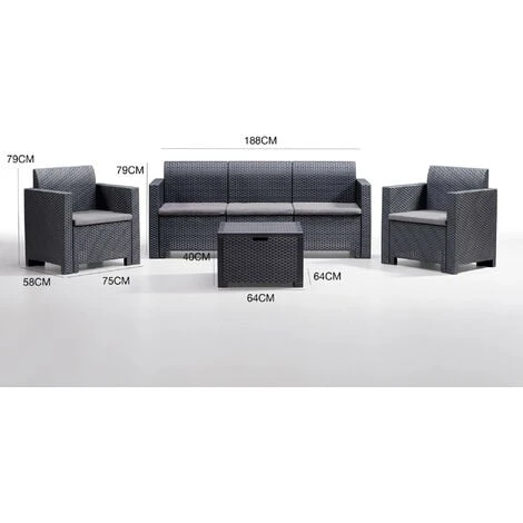 CARATTERISTICHE TECNICHE – Interamente composto in resistente polipropilene, permette di essere posizionato all’aria aperta, resistendo ai raggi solari e alla pioggia, è impermeabile e idrorepellente – Lavabile, facile da pulire – Montaggio semplice e veloce – Ideale per ospitare 5 persone – DIMENSIONI PRODOTTO IN CM – Poltrona: 75x58h79, Sofà: 188x58h79, Tavolino: 64x64h40
