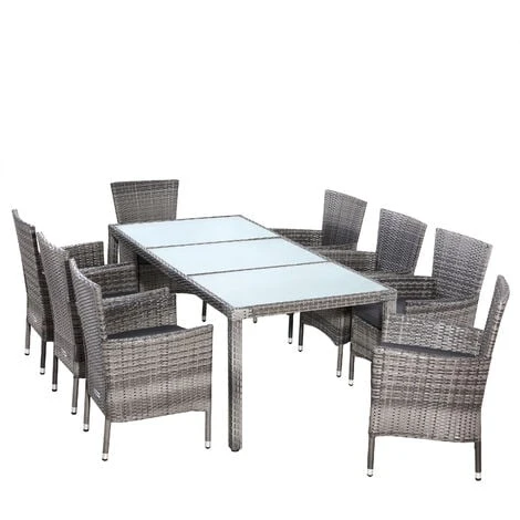 Set di 17 pezzi in polyrattan composto da 1 tavolo, 8 sedie con 8 cuscini sfoderabili (doppia cucitura).