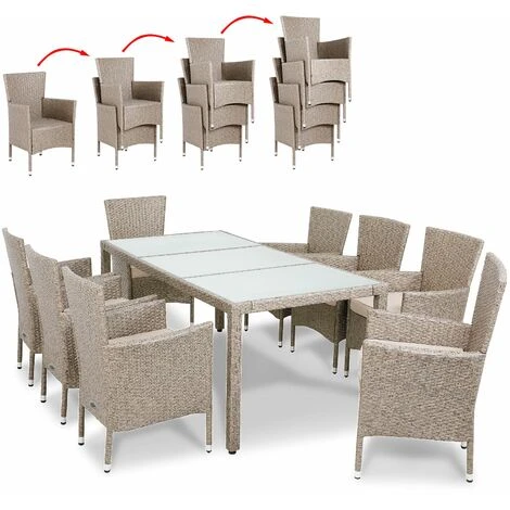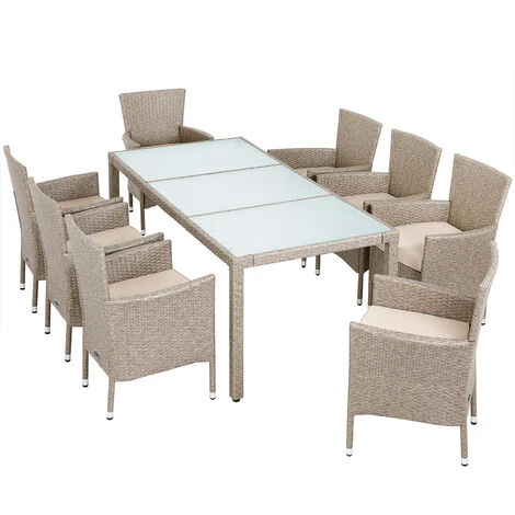 Set di 17 pezzi in polyrattan composto da 1 tavolo, 8 sedie con 8 cuscini sfoderabili (doppia cucitura).