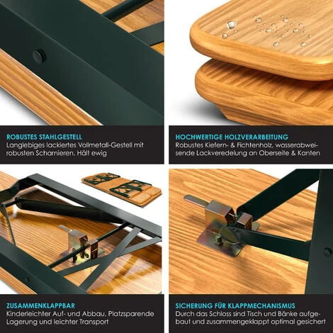 Il set del tendone è composto da un tavolo lungo 170 cm e largo 46 cm e due panche lunghe 170 cm con supporto per ombrellone (chiudibile ermeticamente) fino a un massimo di 6 cm. Anche se bisogna aggiungere altri posti a sedere per gli ospiti, il set tenda da birra pieghevole è la soluzione perfetta! Il set può essere montato e smontato rapidamente ed è quindi facile da trasportare e conservare. Spazio per un massimo di 8 persone: set da 3 pezzi. Set in legno composto da un grande tavolo + due panche. Funzione pieghevole Il tavolo e le panche possono essere ripiegati, in modo da montarli rapidamente se necessario e poi conservati per risparmiare spazio. Porta ombrellone: il gruppo di posti a sedere è composto da un grande tavolo + 2 panche. Al centro del tavolo da birra c’è un incavo chiudibile (Ø 6cm), nel quale si può mettere un ombrellone. Perfetto per: compleanni, feste, eventi o serate barbecue per tutte le stagioni al coperto e all’aperto: questo robusto set di tende da birra KESSER invita a sedersi tutti insieme comodamente. Robusto e durevole: realizzato in legno robusto con telaio in acciaio verniciato, il set offre un’eccellente stabilità. Le parti superiori del legno sono state previamente ricoperte con vernice trasparente per proteggere dalla penetrazione dell’umidità. Questo rende il set particolarmente resistente. Dimensioni: dimensioni del tavolo: 170 x 46 x 75cm (LxPxA) / Dimensioni della panca: 170 x 23 x 46cm (LxPxA) / Materiale: Pino / Abete rosso, il set del tendone è composto da un tavolo lungo 170 cm e largo 46 cm e due panche lunghe 170 cm con supporto per ombrellone (chiudibile ermeticamente) fino a un massimo di 6 cm