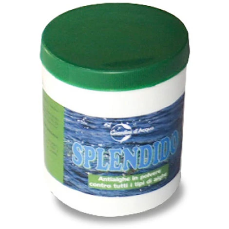 Mini barattolo di Splendido Antialghe in polvere. Un prodotto naturale contro tutti i tipi di alghe La nuova confezione da 200 grammi sufficiente per una dose da 5.000 litri d’acqua del vostro laghetto!