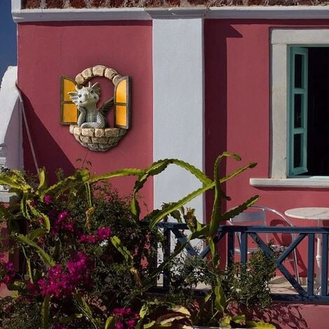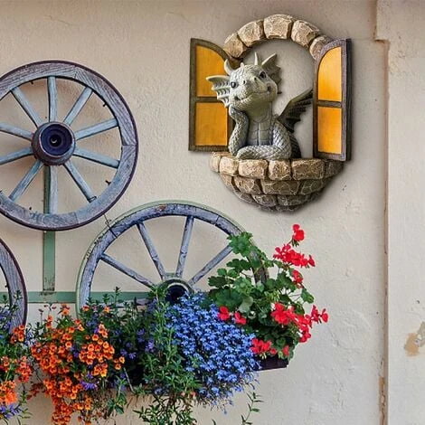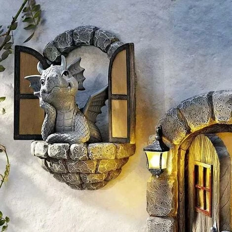Una piccola ragazza drago seduta comodamente sul davanzale della finestra è una simpatica decorazione murale. la decorazione del giardino fa sorridere tutti. Era come se vivessero nel nostro stesso mondo e fossimo vicini.