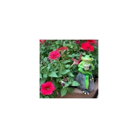 Bel design: una rana verde con in mano una tazza di caffè. Questo design creativo dona un’enorme vitalità al tuo giardino o alla tua casa.