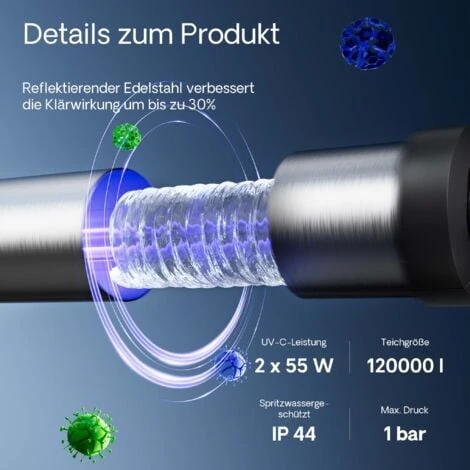 L’acqua del laghetto è aspirata da una pompa e passa per l’alloggiamento, dove scorre fino a una lampada speciale a raggi ultravioletti (UV-C), grazie ai quali tutti i microbi ed i batteri dannosi sono distrutti e la formazione di alghe è ridotta al minimo. In 14 giorni avrete nel vostro laghetto un’acqua limpida e pulita; otterrete un risultato ancora migliore combinando quest’apparecchio ad un filtro biologico.