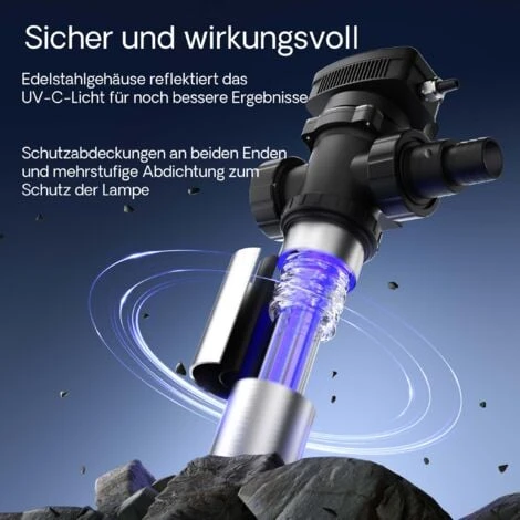 Nell’acqua di scorrimento sono così eliminati germi e batteri nocivi; ma la riduzione dei microbi non ha effetti negativi sul microclima del laghetto, perché i batteri, che sono utili all’equilibrio biologico dello stagno e che eliminano alcune tossine, si posano sulle pietre e possono lì proliferare. La lampada UV contribuisce dunque a far sì che il tasso dei microbi si sviluppi in modo quasi naturale.