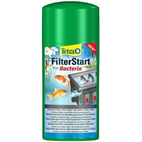 Tetra Pond FilterStartTetra Pond FilterStart attiva il filtro dopo l’inverno o quando si allestisce un nuovo laghetto riducendo la frequenza di pulizia. Il prodotto contiene un mix di batteri altamente attivi, che si insediano sul filtro e decompongono le sostanze dannose, e di batteri che depurano l’acqua riducendo le impurità.DettagliContiene un mix di batteri altamente attivi e depuranti per il filtro;Riduce l’accumulo di inquinanti (ammoniaca e nitriti) nel laghetto mediante l’utilizzo di batteri vivi per il filtro;Scinde le sostanze organiche (feci dei pesci, fogliame, ecc.) grazie a speciali batteri depuranti;Incrementa la durata utile dei filtri per laghetto e gli intervalli di pulizia;Migliora la qualità dell’acqua e previene i fenomeni di putrefazione;Agisce in modo totalmente biologico.Maggiori informazioniTetra Pond FilterStart attiva il filtro dopo l’inverno o quando si allestisce un nuovo laghetto riducendo la frequenza di pulizia. Il prodotto contiene un mix di batteri altamente attivi, che si insediano sul filtro e decompongono le sostanze dannose, e di batteri che depurano l’acqua riducendo le impurità. I batteri utili ed efficaci che si insediano sul filtro sono importanti per mantenere un equilibrio biologico sano e una buona qualità dell’acqua. I batteri vivi che si insediano sul filtro riducono l’accumulo di inquinanti (ammonio e nitriti) nel laghetto. Gli speciali batteri che depurano l’acqua decompongono le sostanze organiche che si depositano sul filtro a causa delle feci dei pesci e del fogliame nell’acqua del laghetto. Questi processi di decomposizione biologica prevengono i fenomeni di putrefazione. Oltre all’effetto benefico sulla qualità dell’acqua, il prodotto prolunga la durata del filtro del laghetto, riducendo la frequenza di pulizia. Tetra Pond FilterStart agisce in modo totalmente biologico. Questa caratteristica lo rende perfetto per la cura del laghetto e previene la contaminazione, in particolare in primavera, quando inizia la stagione del laghetto, e dopo la pulizia del filtro o terapie medicinali.Formato da 500 ml per 5.000 litri di acqua del laghetto.